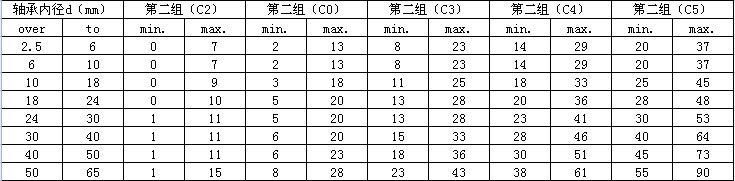 深沟球轴承的径向游隙按ISO标准可分为五组,分别是基本组(或者叫普通组)、小游隙组(C2)、大游隙组(C3、C4、C5),其参数如下:
