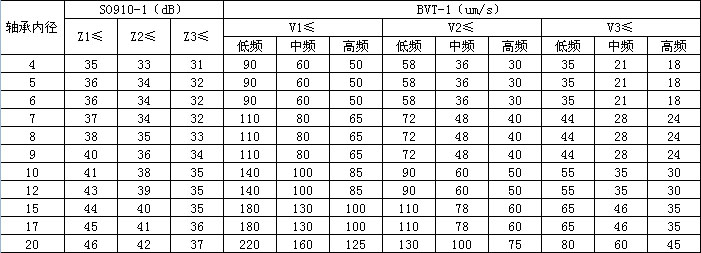 轴承的振动噪音分为三级,分别是Z1、Z2、Z3,采用SO910-1仪表来检测。当有特殊要求时,可用BTV-1来检测,用V1、V2、V3来表示,其数据参照如下。