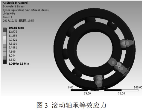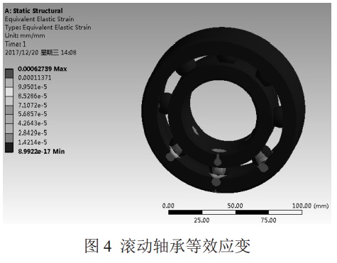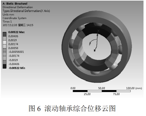 分别对3种不同的工况下发电机轴承接触应力进行研究。对有限元模型内圈滚道的内表面下半部分施加径向载荷Fr,载荷大小依次为1kN~8kN。下面给出径向载荷Fr=2000N时具体的滚动轴承整体在径向力作用下的等效应力、应变,如图3、图4所示。滚动轴承滚动体接触应力,如图5所示。滚动轴承整体综合位移,如图6所示。