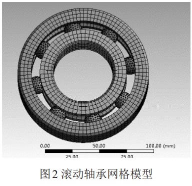 对滚动轴承有限元模型进行网格划分,网格划分方式选择自动划分网格,滚动体与内外圈接触处区域网格进行局部细化。划分后滚动轴承网格模型如图2所示,节点个数为856330,单元个数为579342.