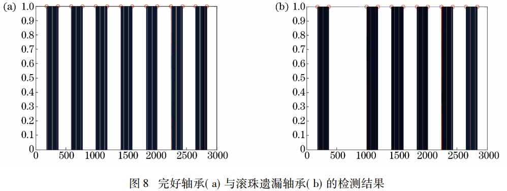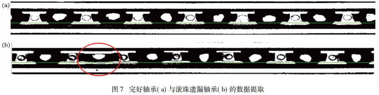 图8(a)为完好轴承的检测结果,获取的数据有7个柱状图,表明被检测轴承拥有7颗滚珠,为完好轴承。图8(b)为滚珠遗漏轴承的检测结果,获取的数据只有6个柱状图,表明被检测轴承只拥有6颗滚珠,最终判别为滚珠遗漏轴承,为残次品,应被剔除。根据实验结果可知,该方法对80个完好轴承的识别率为92.5%,对60个滚珠遗漏轴承的识别率为93.3%。