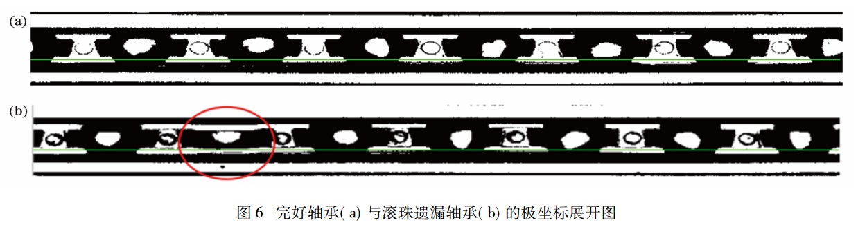 本文将采集到的圆环状的轴承图像利用极坐标方式归一化为矩形的轴承图像,这样既去掉了圆环内外不需要的像素,压缩图像的大小,又便于后续对轴承中的各类缺陷,如滚珠的遗漏、表面存在的铁锈、表面的划痕、铆钉的不合格等,进行识别和特征值提取。图6(a)、(b)分别为完好轴承与滚珠遗漏轴承的极坐标展开图。