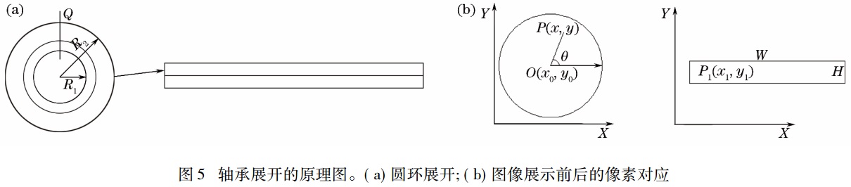 图像归一化是对图像进行一系列标准的处理,使之变换为具有固定标准形式的过程,该具有固定标准形式的图像被称作归一化图像。极坐标归一化原理如图5(a)所示,沿Q的方向对内外环之间的圆周进行展开(Q由沿圆环半径方向上的一条射线与圆环的内外环交点的连线所确定),使其变成一条直线。以其作为参照,对内外半径之间的圆环进行展开操作,得到矩形图。取参照圆中的一点P(x,y),R1为内圆半径,R2为外圆半径,圆的半径R=(R1+R2)/2,O(x0,y0)为所取参照圆的圆心。展开之后图像的规格为W*H,其中H是矩形展开图的高度R2-R1,W为矩形展开图的宽度π(R1+R2)。图像展开前后的像素对应关系如图5(b)所示,点P(x,y)对应到展开图像中的点为P1(x1,y1),展开图像和原图像中点P对应的点P1的坐标值为