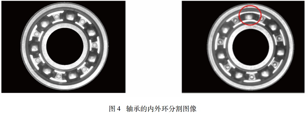为了便于后续图像处理,将被定位的轴承从背景图像中分割出来,以排除背景对图像处理的不良影响。轴承内外环图像的分割如图4所示。