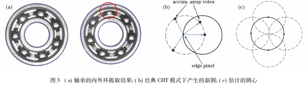 采集到的轴承图像经中值滤波,对其采用圆形Hough变换(CHT)来确定轴承的内外环。当内外环确定之后,被检测轴承也就相当于被定位了。轴承的内外环提取如图3(a)所示。