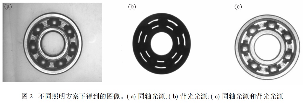本文在实验初期设计了3种照明方案用于轴承图像的采集:方案1,采用同轴光源作为图像采集光源;方案2,采用背光光源作为图像采集光源;方案3,采用同轴光源和背光光源组合而成的照明系统作为图像采集光源。